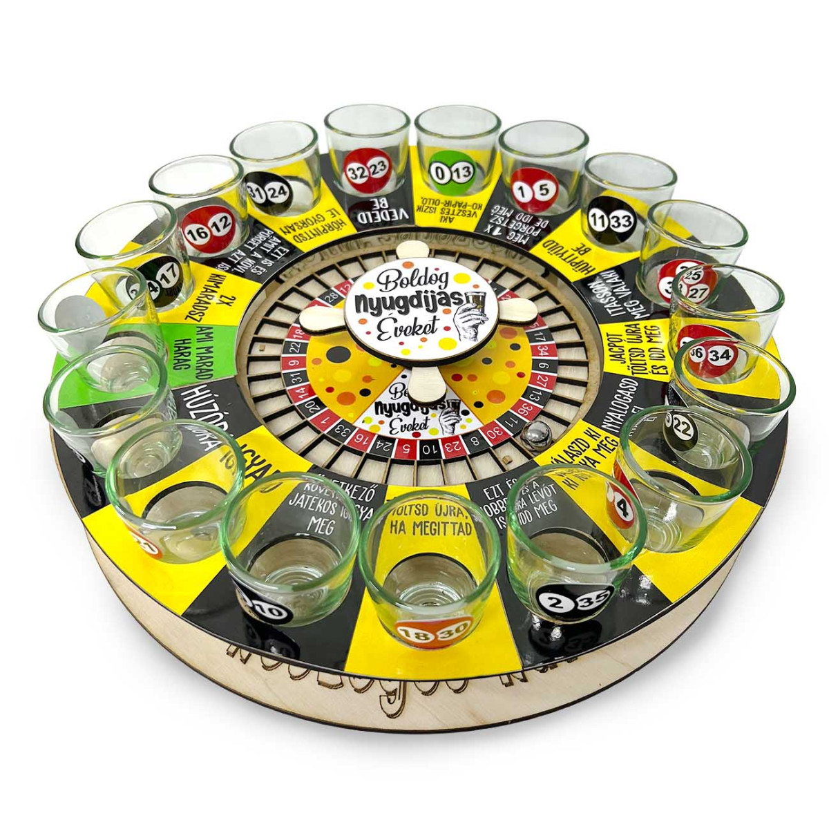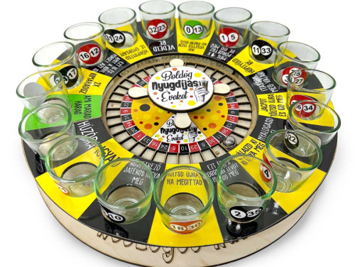 Egy látványos, pörgős és szórakoztató rulett alapú ivós játék, amely kifejezetten nyugdíjasoknak készült vicces feliratokkal, humoros feladatokkal és frappáns életbölcsességekkel. A táblán körben elhelyezett feles poharak, a pörgő golyó és a nyugdíjas tematikájú mezők igazi bulihangulatot teremtenek minden társaságban.