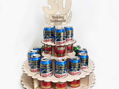 Ez a sör torta praktikus és újrahasznosítható alternatívája a hagyományos születésnapi tortáknak. Masszív fa szerkezete stabil tartást ad a dobozoknak, így biztonságosan szállítható és látványosan tálalható. A 7 cm-es kivágások pontosan illeszkednek a 0,5 l-es dobozos sörökhöz, így a kedvenc márkákkal töltheted meg.