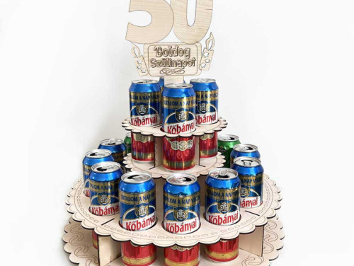 Ha egy igazán látványos és emlékezetes 50. születésnapi ajándékot keresel, ez a fából készült sör torta tökéletes választás! A 50. „Boldog Szülinapot” feliratú dísz topperrel ellátott két szintes sörös állvány garantáltan feldobja az ünneplést és mosolyt csal az ünnepelt arcára.