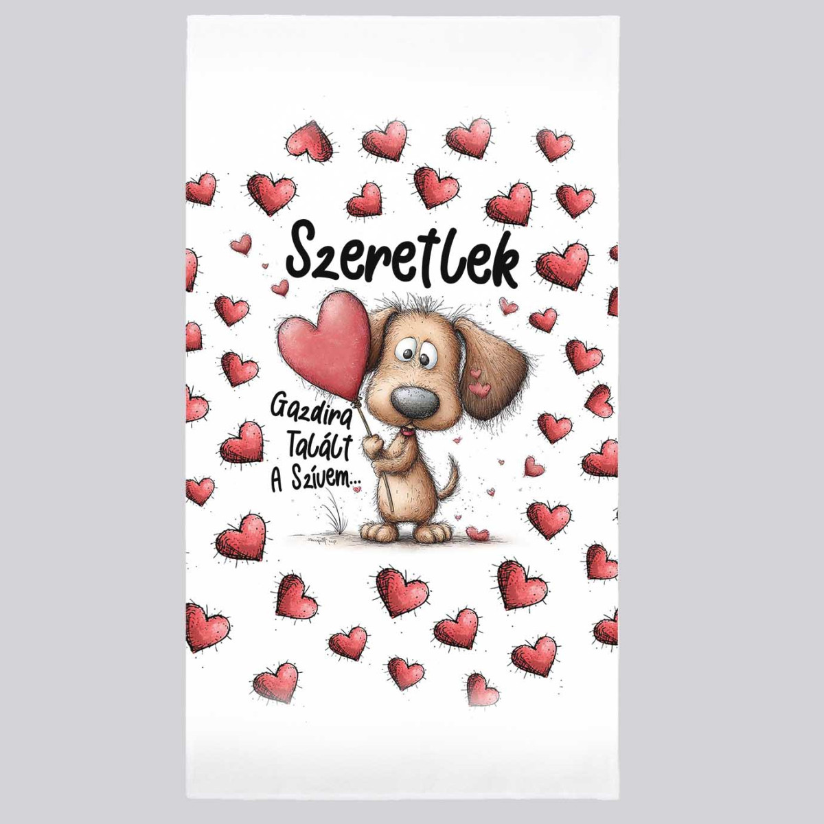 Szerelmes mintás törölköző 50×100 cm - Szeretlek "Gazdira talált a szívem" feliratú kutyás törölköző – Valentin napi ajándék