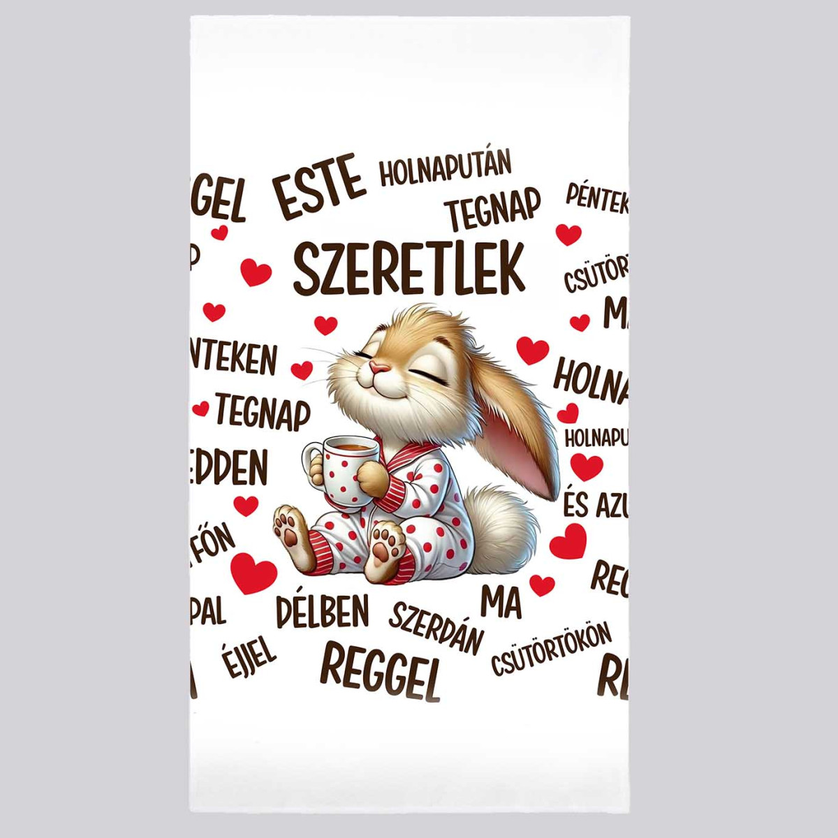 Szerelmes mintás törölköző 50×100 cm - "Szeretlek - Mindig Nyuszis" feliratú macis törölköző – Valentin napi ajándék