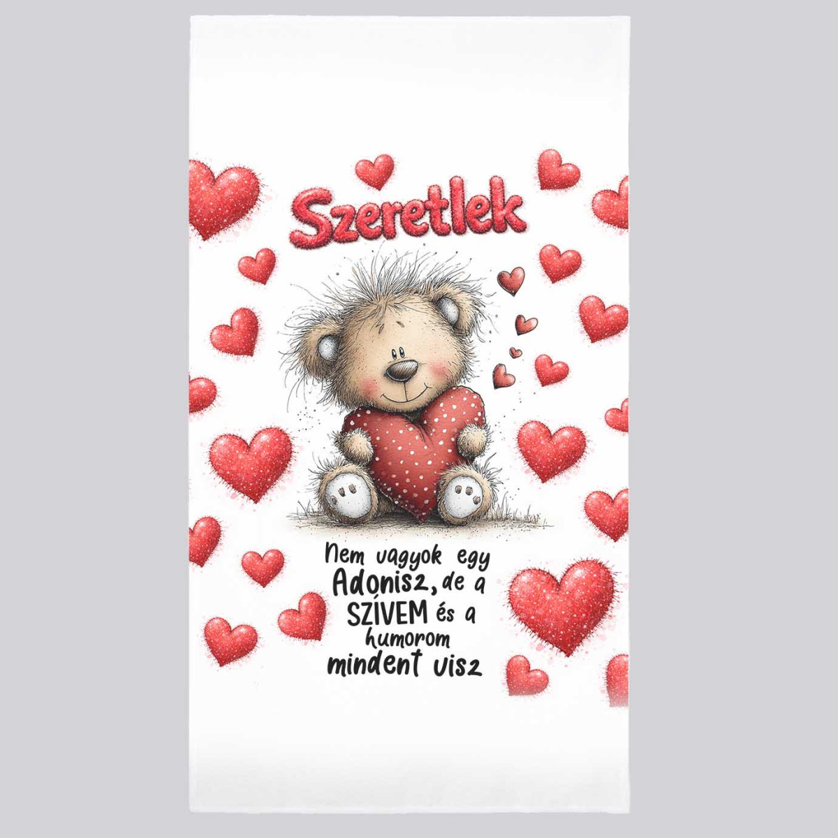 Szerelmes mintás törölköző 50×100 cm - „Szeretlek, nem vagyok egy Adonisz” mintával törölköző | Vicces, szerelmes ajándék