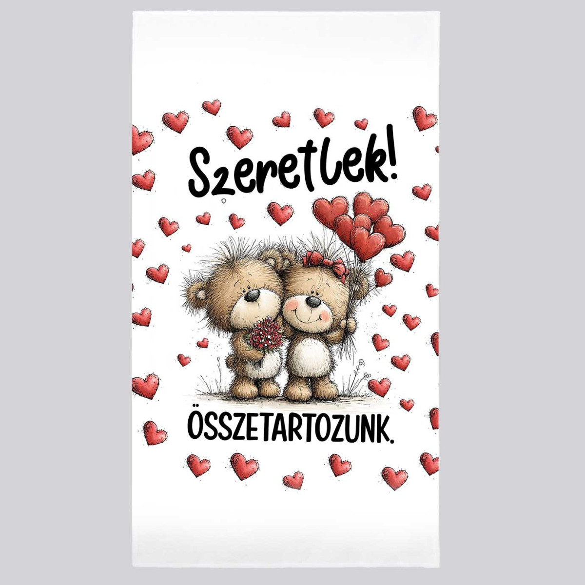 0 értékelés a következőhöz: Szerelmes mintás törölköző 50×100 cm - Szeretlek "Összetartozunk" feliratú macis törölköző – Valentin napi ajándék