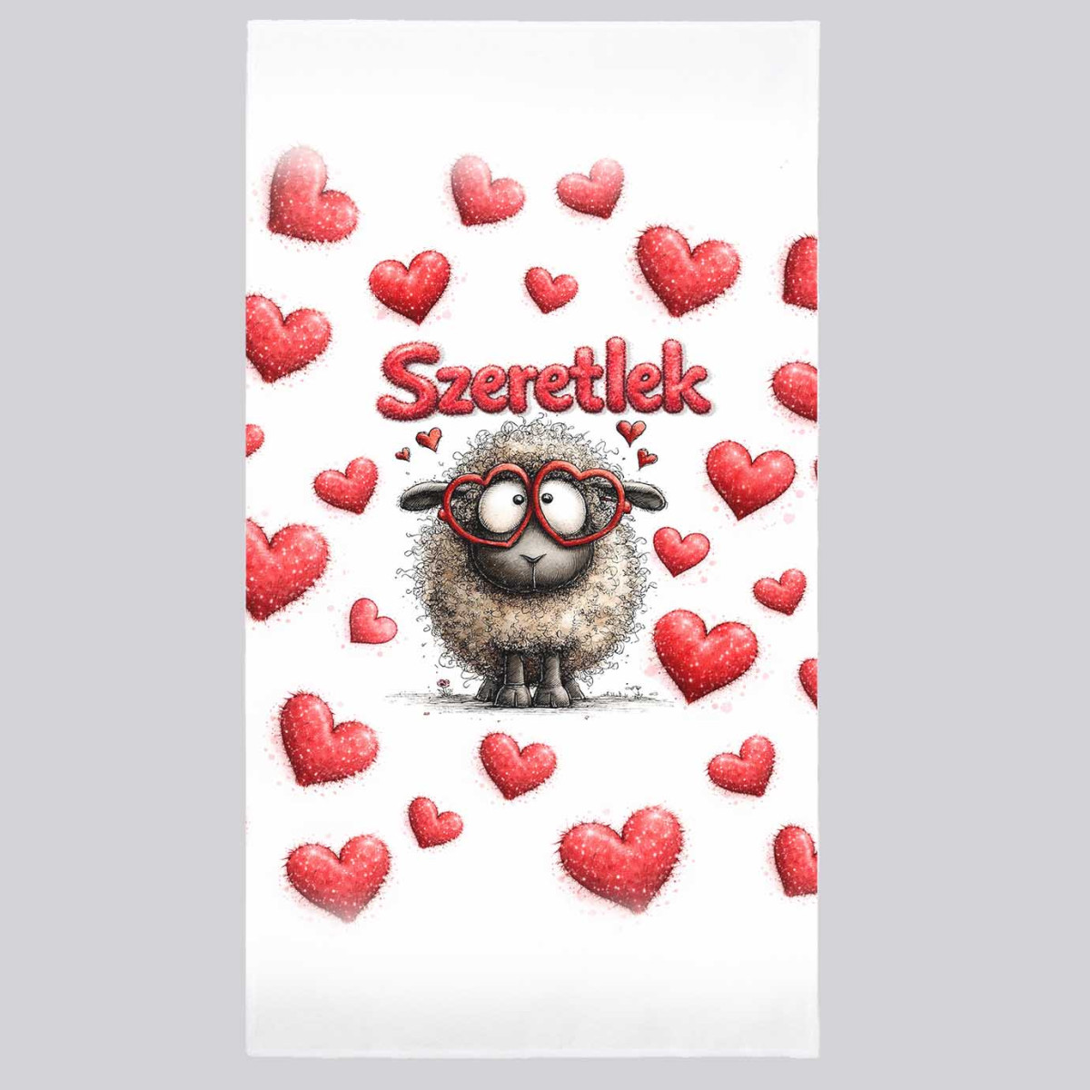 Szerelmes mintás törölköző 50×100 cm - „Szeretlek” szöveggel, vicces szemüveges bárány mintával törölköző | Vicces, szerelmes ajándék