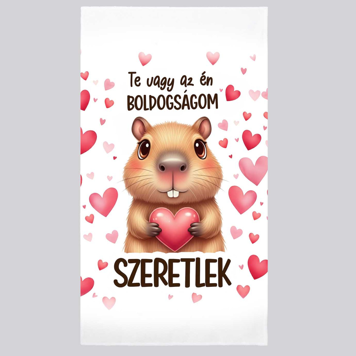 Szerelmes mintás törölköző 50×100 cm - "Te vagy az én boldogságom" feliratú kapibarás törölköző – Valentin napi ajándék