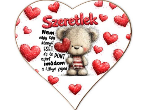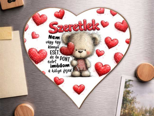 Ez a szív alakú hűtőmágnes aranyos macis grafikával, szívecskés háttérrel és humoros, szerethető felirattal készült: „Nem vagy egy könnyű eset, de pont ezért imádlak.”