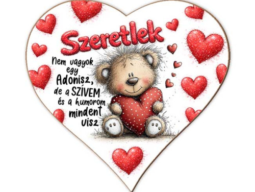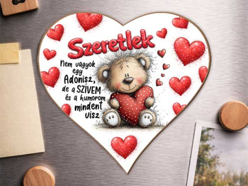Ez a szív alakú hűtőmágnes aranyos macis grafikával, szívecskés háttérrel és őszinte, mosolyt csaló felirattal készült: „Nem vagyok egy Adonisz, de a szívem és a humorom mindent visz.”