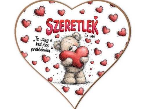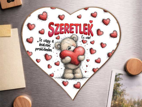Lepd meg a párod egy igazán szerelmes és vicces Valentin-napi ajándékkal! Ez a szív alakú hűtőmágnes egy aranyos mackós grafikával és a jól ismert, mosolyt csaló üzenettel készül: „Szeretlek… te vagy a kedvenc problémám.”