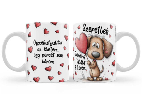 Ez a szerelmes tacskós bögre egyszerre vicces és megható. A szívecskét tartó cuki kutyus és a „Gazdira talált a szívem” felirat mosolyt csal az arcra, miközben egy nagyon őszinte üzenetet közvetít: megtaláltam azt, akihez tartozom.