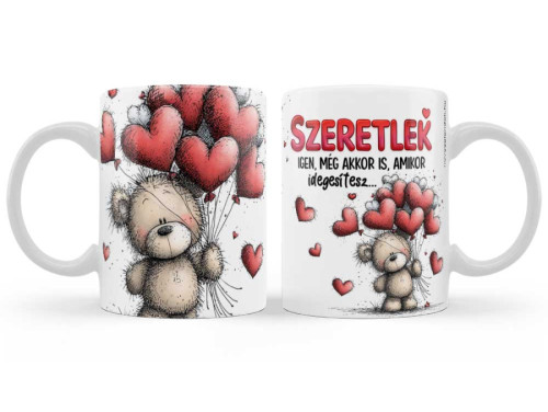 Ez a szerelmes macis bögre tökéletes választás azoknak, akik szerint az igazi szeretet nem csak a tökéletes pillanatokról szól. A szívecskés lufikat tartó cuki maci és a „Szeretlek – igen, még akkor is, amikor idegesítesz” felirat egyszerre romantikus, őszinte és mosolyt csaló.