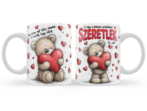 Ez a szerelmes macis bögre tökéletesen megfogalmazza azt, amit sok pár érez, de nem mindig mond ki: igen, néha idegesítjük egymást – de ettől még (vagy éppen ezért) szeretjük a másikat. A szívecskét ölelő cuki maci és a „Szeretlek – Te vagy a kedvenc problémám” felirat egyszerre vicces, őszinte és nagyon szerethető.