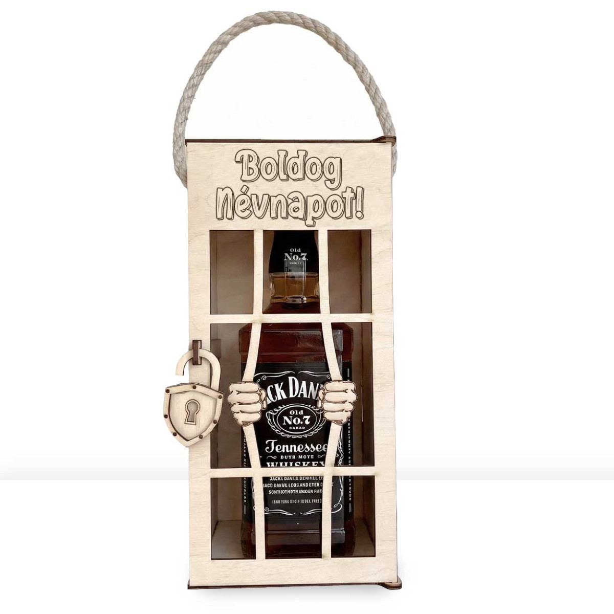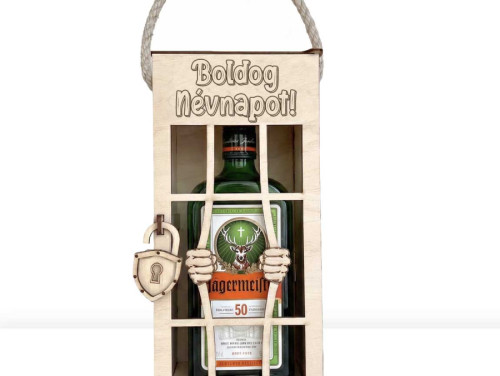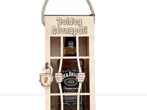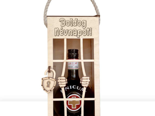 Vicces Börtönös Italos Díszdoboz Fa Italtartó 0,7 l Italokhoz - Boldog Névnapot felirattal Gravírozva - Névnapi Ajándék
