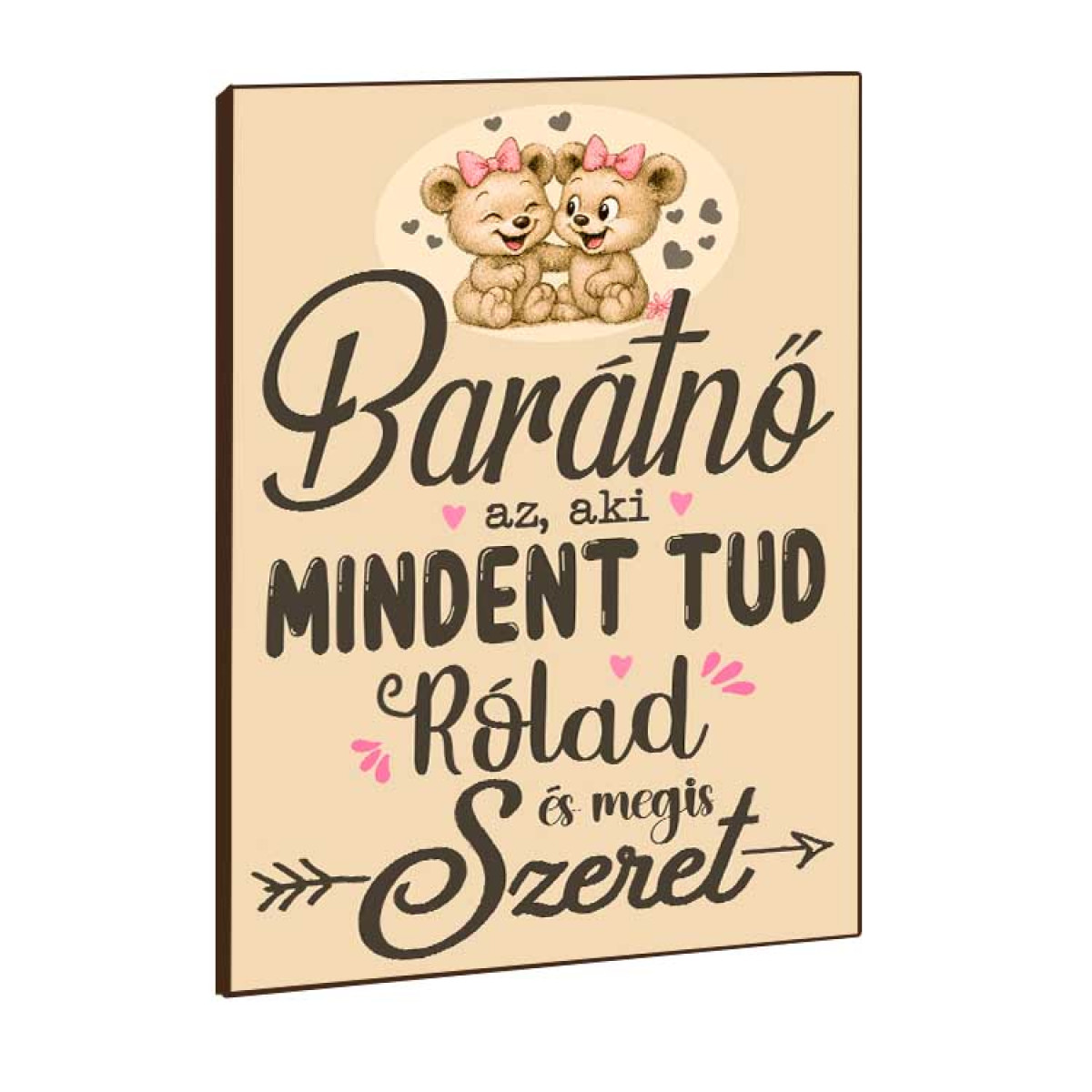 A kedves mackópár grafikája és a szív alakú díszítések igazán bájossá teszik ezt a barátnős ajándékot, amely tökéletes meglepetés születésnapra, névnapra, barátság napjára vagy egyszerűen csak a szeretet kifejezésére.