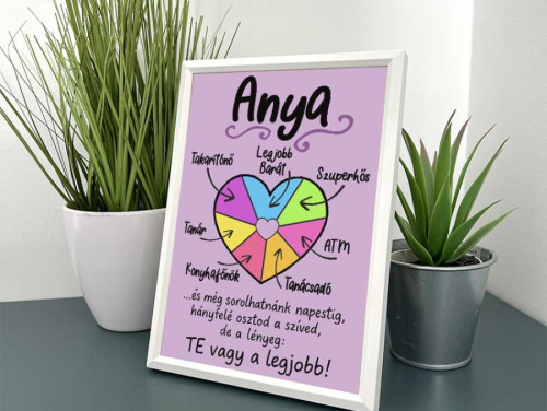 Lepd meg édesanyádat ezzel a színes, keretezett fali és asztali képpel, amely vidám grafikájával és szeretetteljes üzenetével garantáltan mosolyt csal az arcára. A felirat játékosan sorolja fel, hány szerepet tölt be egy anya – szuperhős, tanár, takarítónő, konyhafőnök, legjobb barát és tanácsadó – de a lényeg egy: Te vagy a legjobb!