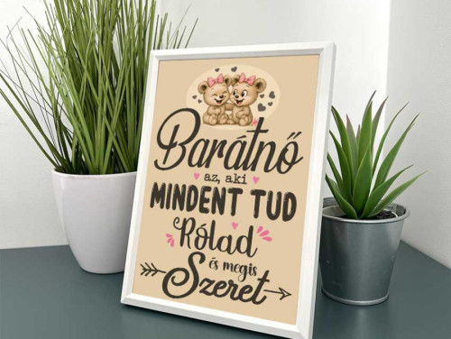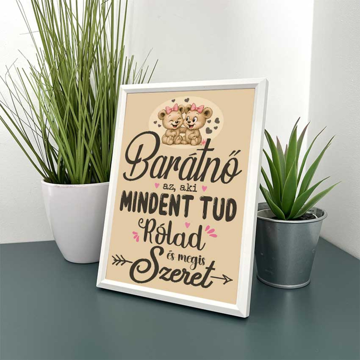 Vicces Kép Kerettel 13,5×18,5 cm – Barátnő, aki mindent tud rólad és mégis szeret - Vicces Ajándék Barátnőnek Kicsi Kép Falra és Asztalra is Helyezhető Kép