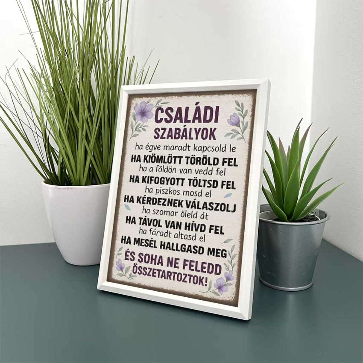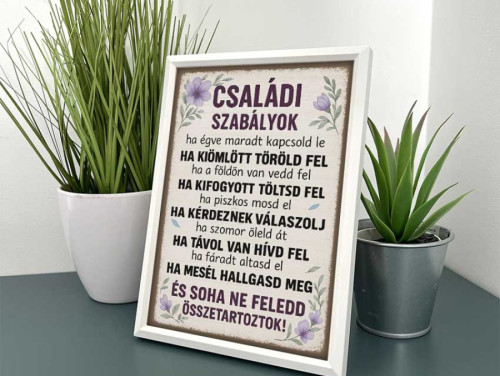 Hozd közelebb egymáshoz a családot ezzel a stílusos, keretezett fali és asztali képpel, amely játékos, de tanulságos családi szabályokat sorol fel. A szöveg kedvesen emlékeztet a mindennapi figyelmességekre – a lámpa lekapcsolásától a szeretetteljes ölelésekig –, és a legfontosabbra: soha ne feledd, összetartoztok!