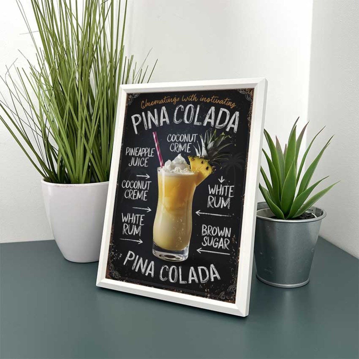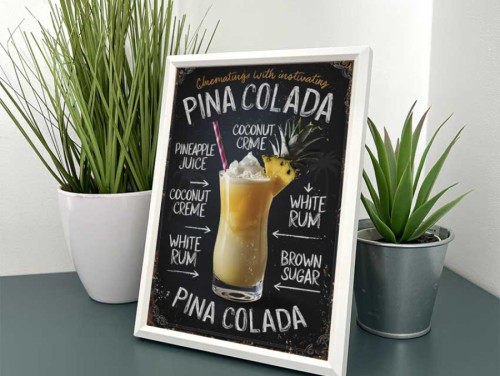 Idézd fel a trópusi nyaralások hangulatát ezzel a stílusos, keretezett fali és asztali képpel, amely a legendás Pina Colada koktél receptjét mutatja be. A vintage tábla stílusú háttér és az egzotikus ananászos-kókuszos illusztráció azonnal friss, nyárias életérzést varázsol otthonodba.
