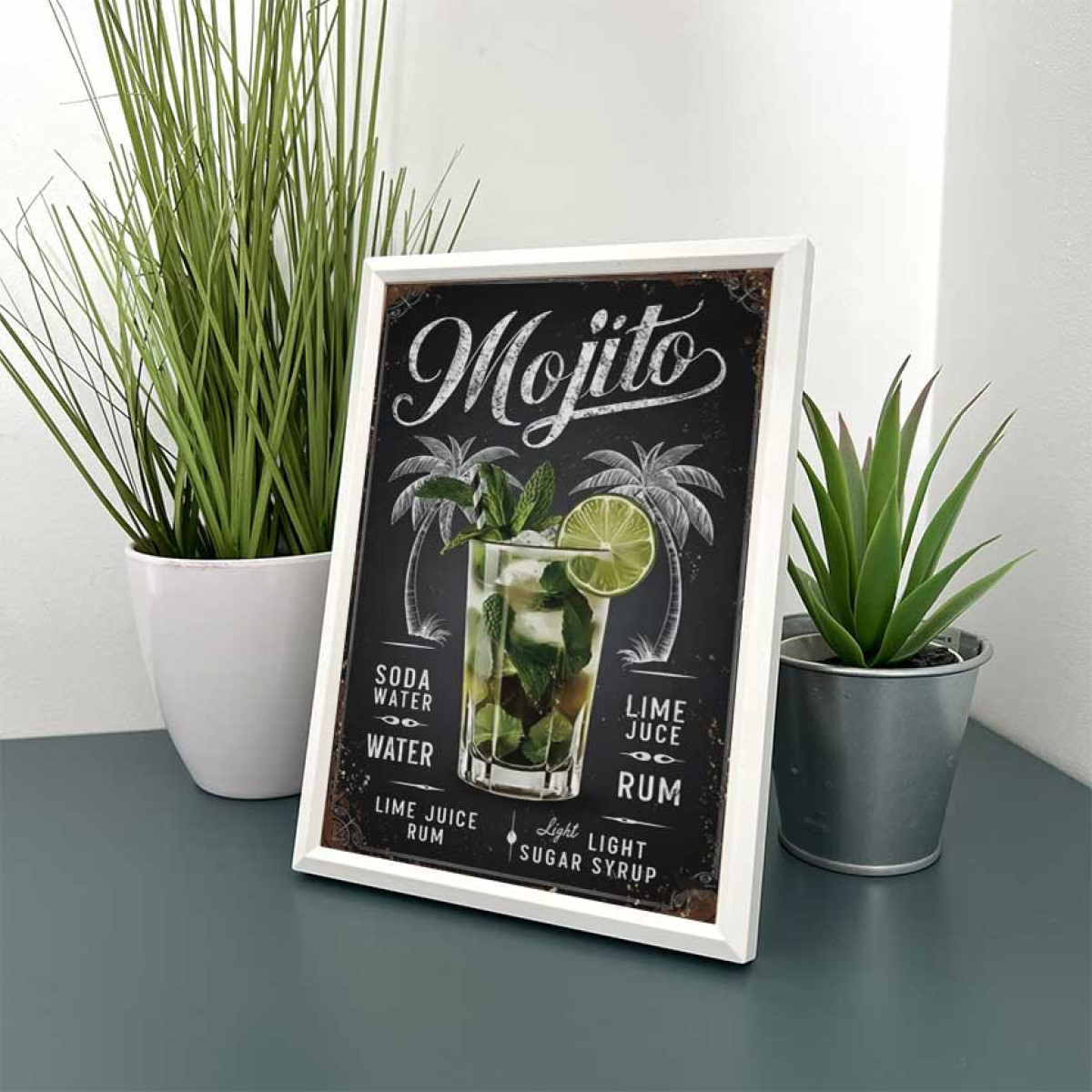 Varázsold el otthonodat a karibi életérzéssel ezzel a stílusos, keretezett fali és asztali képpel, amely a klasszikus Mojito koktél receptjét mutatja be. A fekete tábla hatású háttér és a frissítő, zöld lime- és mentalevél grafika egyaránt elegáns és vidám hangulatot kölcsönöz konyhádnak vagy bárpultodnak.