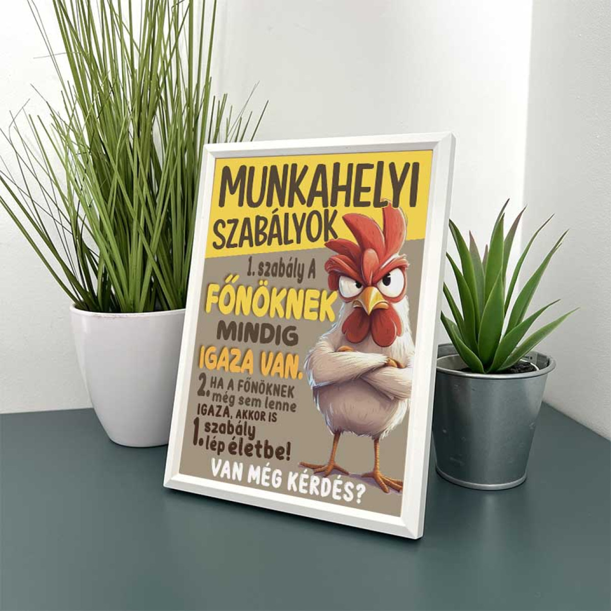 Vicces Kép Kerettel 13,5×18,5cm – Munkahelyi Szabályok - Vicces Ajándék Kollégának Kicsi Kép Falra és Asztalra is Helyezhető Kép