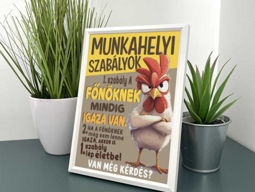 Humoros irodai falikép, amely minden munkahely legfontosabb „szabályát” mutatja be: a főnöknek mindig igaza van! A dühös kakas grafikával készült vicces dekoráció garantáltan feldobja a hangulatot az irodában vagy otthoni dolgozószobában.