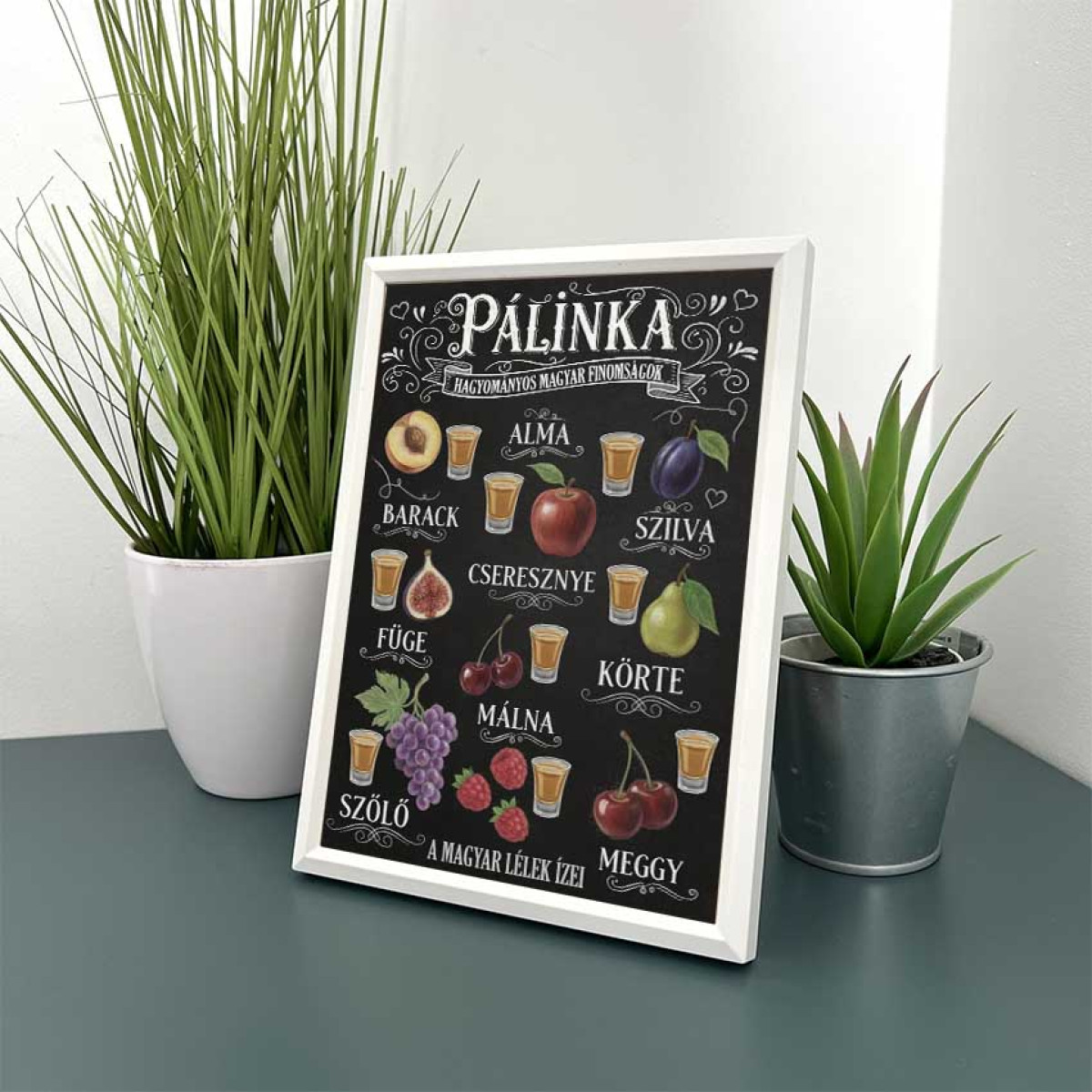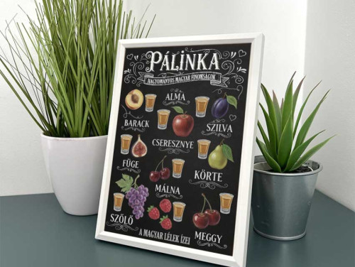 Fedezd fel a magyar pálinka sokszínű világát ezzel a stílusos, keretezett fali és asztali képpel, amely a legnépszerűbb pálinkafajtákat mutatja be gyönyörű illusztrációkkal. Alma, barack, szilva, körte, cseresznye, málna, meggy és még sok más finomság – mind a magyar hagyomány ízeit idézik.