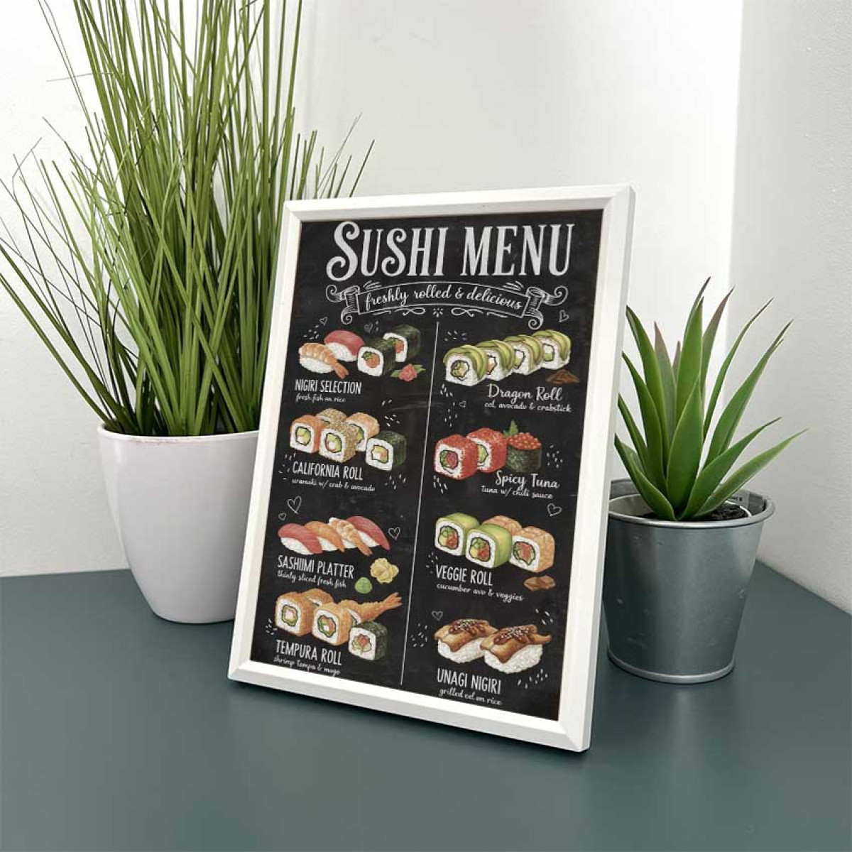 Dobd fel konyhádat vagy étkeződet ezzel a 13,5x18,5 cm-es fali és asztali képpel, amely a legnépszerűbb sushi fajtákat mutatja be ínycsiklandó illusztrációkkal. Nigiri, California roll, Dragon roll, Spicy tuna, Sashimi platter és még sok más kedvenc egy látványos, krétatábla stílusú dizájnon.
