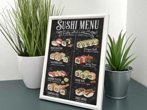 Vicces Kép Kerettel 13,5×18,5cm – Sushi Menu - Japán Sushi fajták dekoráció és ajándék
