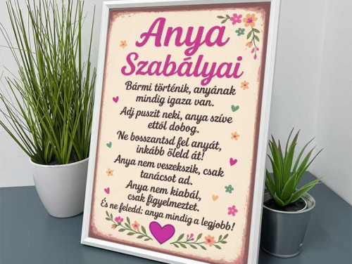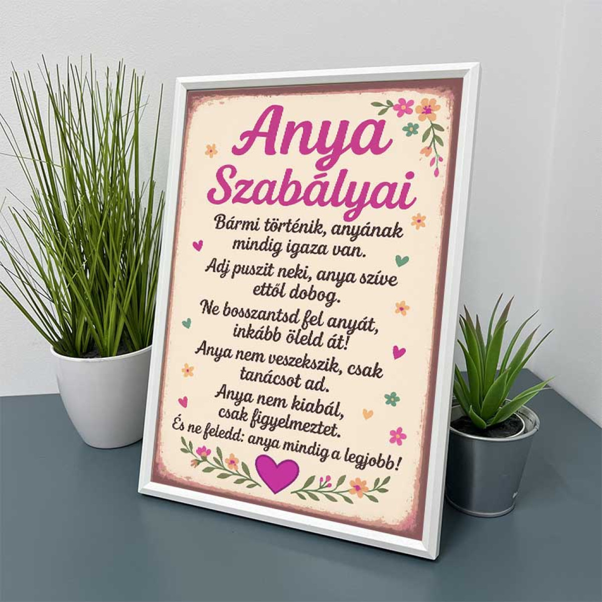 Vicces Kép Kerettel 21×30 cm – Anya Szabályai - Anyák napi ajándék, szívmelengető dekor Anyáknak