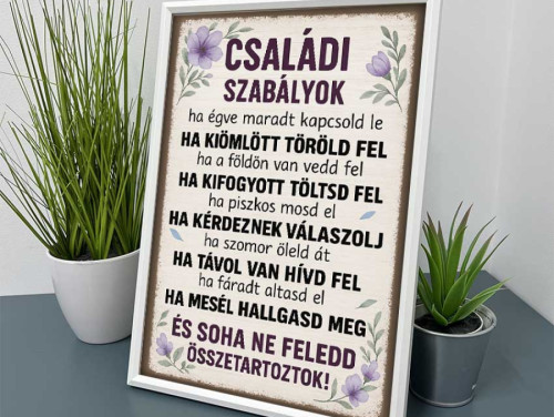 Hozd közelebb egymáshoz a családot ezzel a stílusos, keretezett fali és asztali képpel, amely játékos, de tanulságos családi szabályokat sorol fel. A szöveg kedvesen emlékeztet a mindennapi figyelmességekre – a lámpa lekapcsolásától a szeretetteljes ölelésekig –, és a legfontosabbra: soha ne feledd, összetartoztok!