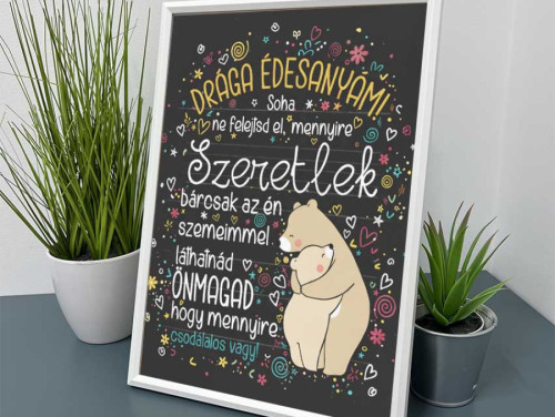 Lepd meg édesanyádat ezzel a megható, keretezett fali és asztali képpel, amely szeretetteljes üzenettel emlékezteti, mennyire különleges és fontos számodra. A színes, szívecskés, vidám grafika és a bensőséges szöveg minden nap mosolyt csal majd az arcára.