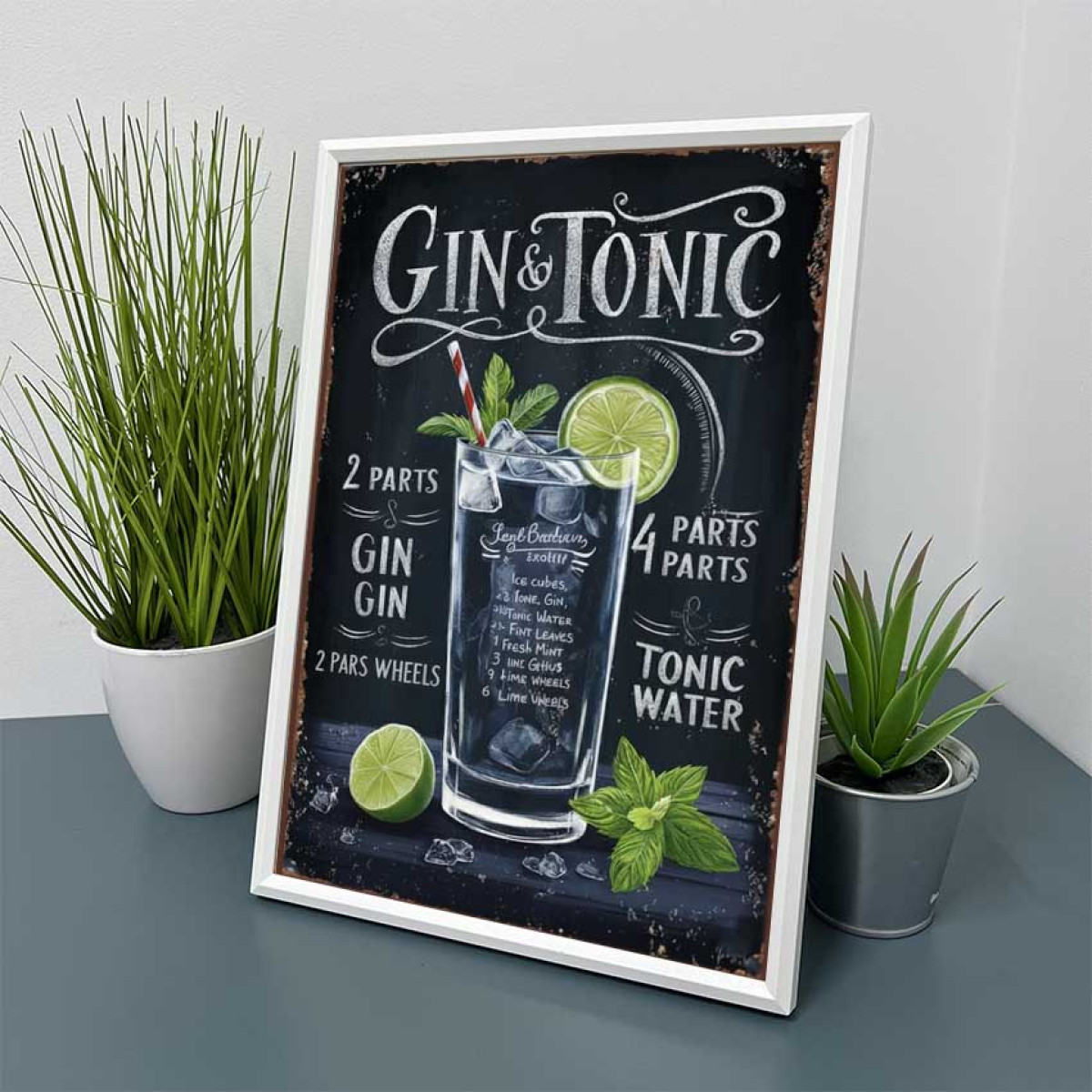 Vicces Kép Kerettel 21×30 cm – Gin & Tonic - Italrecept dekor konyhába, bárba