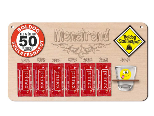 Vicces 50. születésnapi ajándék – Éves Menetrend tábla óvszerrel és pálinkás pohárral