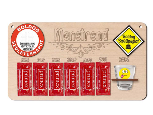 Vicces digitális születésnapi ajándék – Éves Menetrend tábla óvszerrel és pálinkás pohárral