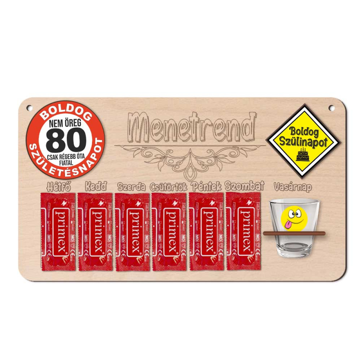 Vicces 80. születésnapi ajándék – Heti Menetrend tábla óvszerrel és pálinkás pohárral