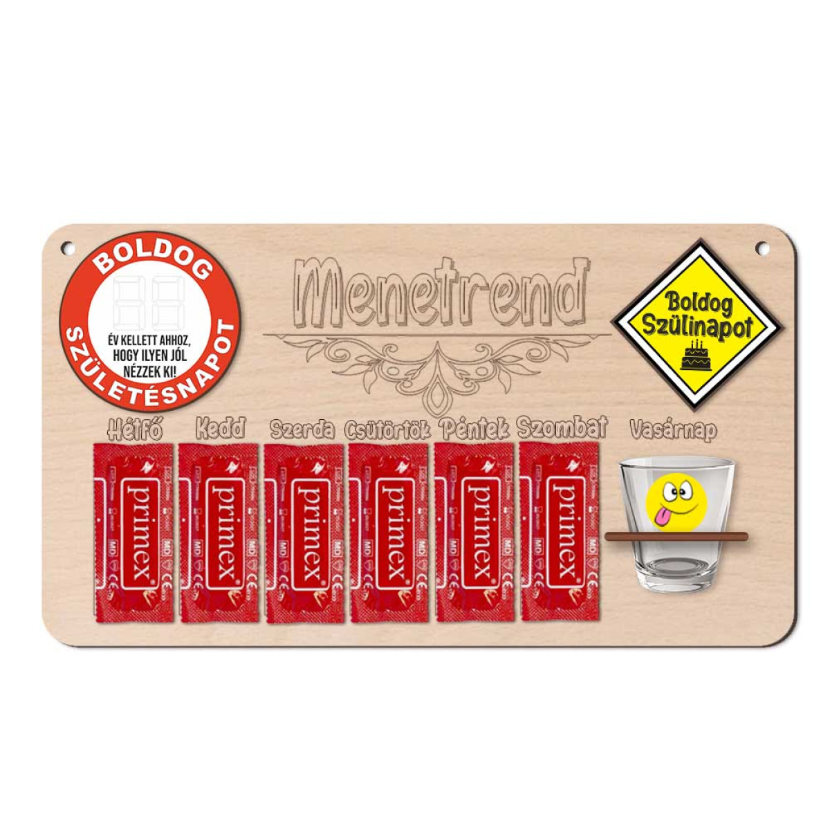 Vicces digitális születésnapi ajándék – Heti Menetrend tábla óvszerrel és pálinkás pohárral