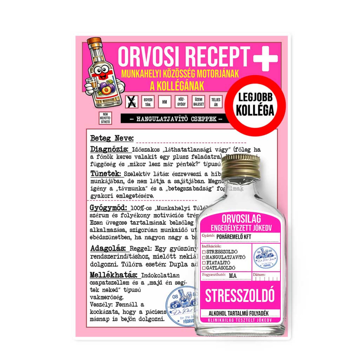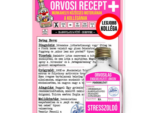 Keresed a tökéletes ajándékot a kedvenc kollégádnak, aki nélkül megállna az élet az irodában? Ez a vicces orvosi recept és a hozzá tartozó laposüveg a leghatékonyabb gyógymód a hétköznapi mókuskerék ellen. Ideális választás búcsúztatóra, névnapra, vagy ha csak szeretnéd megköszönni, hogy segít túlélni a hétfőket.