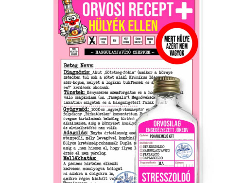 Vannak napok, amikor a környezetedben túl sok a „sötét alak”? Ez a vicces orvosi recept és a hozzá tartozó laposüveg a leghatékonyabb védőfelszerelés az emberi butaság ellen. Ideális ajándék irodai környezetbe, baráti összejövetelekre vagy bárkinek, aki napi szinten küzd az értetlenséggel.