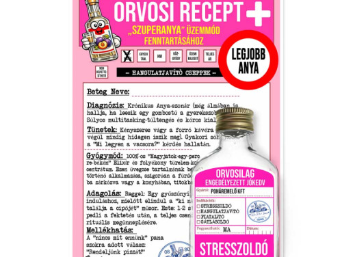 Minden anya egy szuperhős, de még a hősöknek is szükségük van néha egy kis „üzemanyagra”. Ez a vicces orvosi recept anyáknak és a hozzá tartozó laposüveg a legtökéletesebb ajándék, ha szeretnéd kifejezni az elismerésedet egy kis humorral fűszerezve.