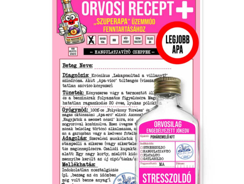 Keresed a tökéletes ajándékot az öregnek, akinek már mindene megvan, de a humorérzéke a régi? Ez a vicces orvosi recept apáknak és a hozzá tartozó laposüveg garantáltan telitalálat minden olyan családfőnek, aki profi szinten űzi a spórolást és a szóvicceket.