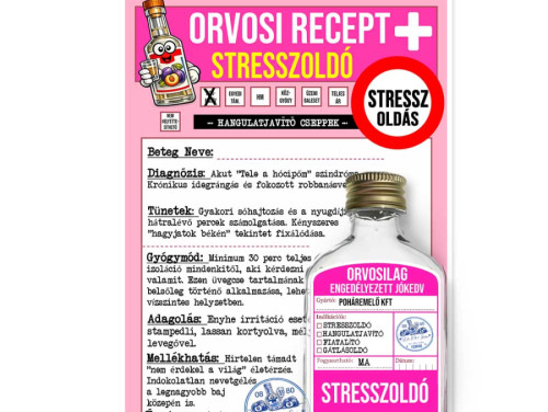 Úgy érzed, a környezetedben mindenkinek „akut idegrángása” van? Vagy te magad számolod a nyugdíjig hátralévő perceket? Ez a stresszoldó orvosi recept és laposüveg szett a legjobb humoros terápia a hétköznapi feszültség ellen. Tökéletes ajándék mindenkinek, akinek szüksége van egy kis kikapcsolódásra.